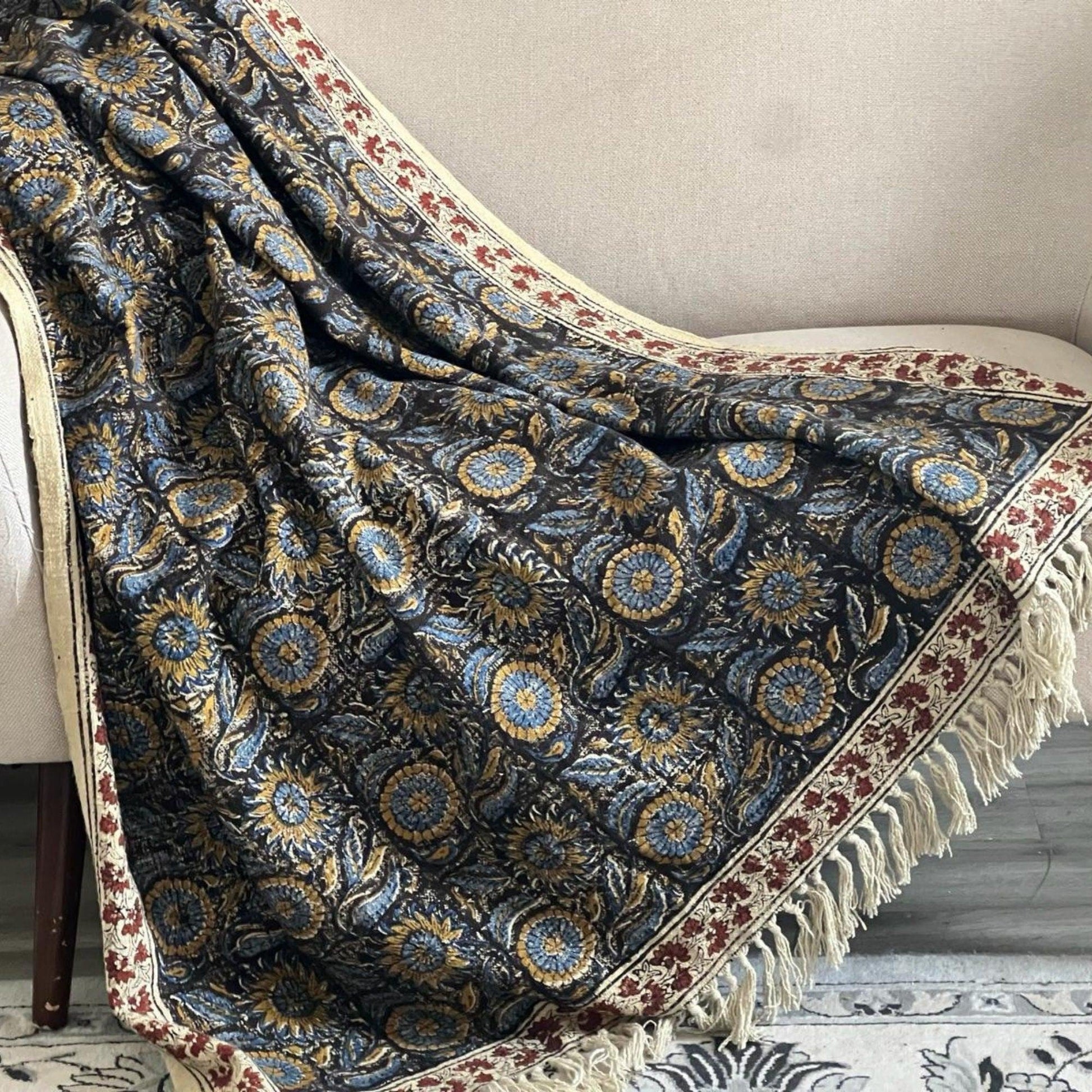 Floral Cotton Throw Blanket: Handmade Block Print, Boho Decor (72" x 52")