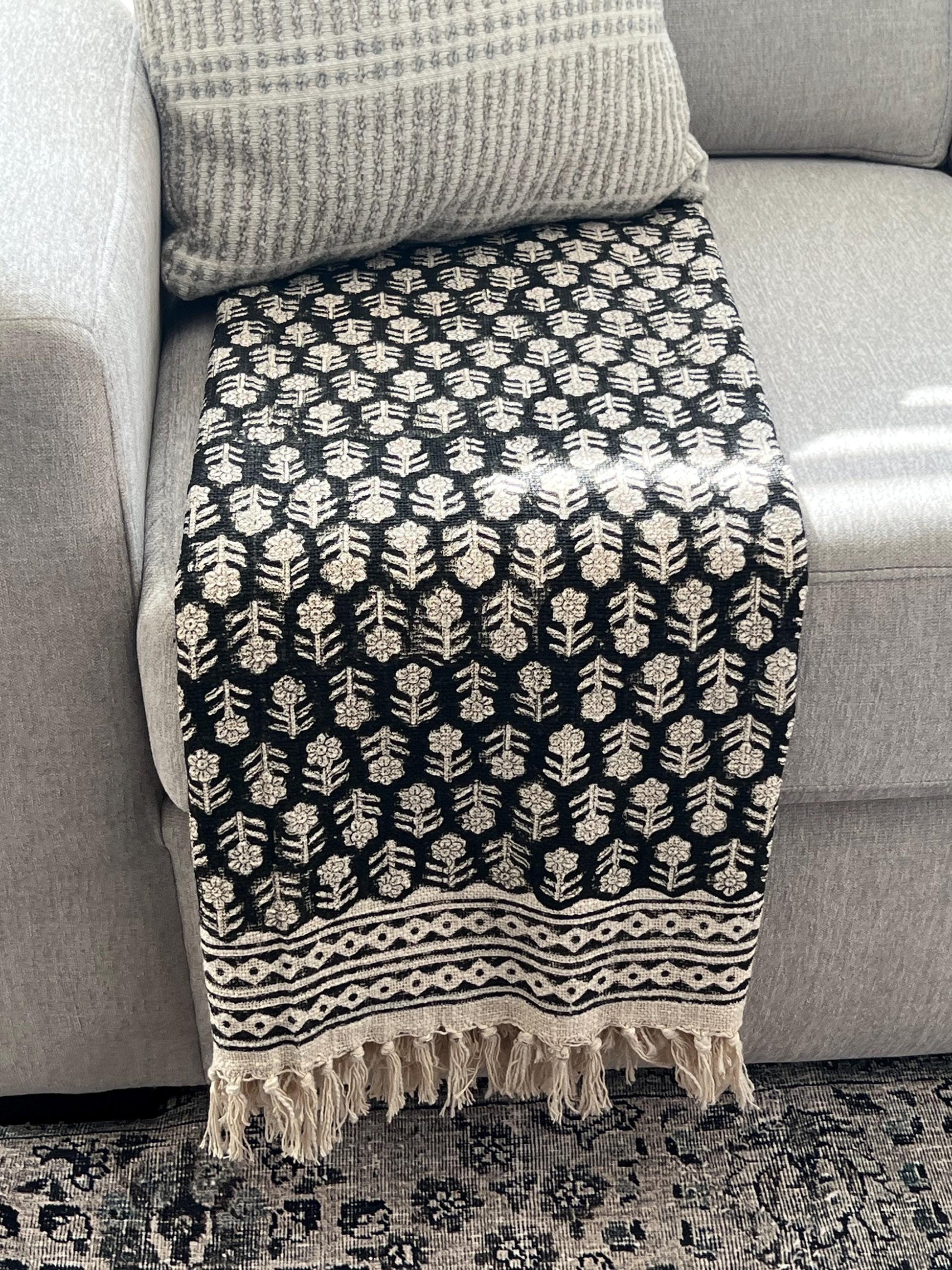 Black Hand Block Print Cotton Throw Blanket: Boho Floral Tassels Boho Blanket for Home Decor