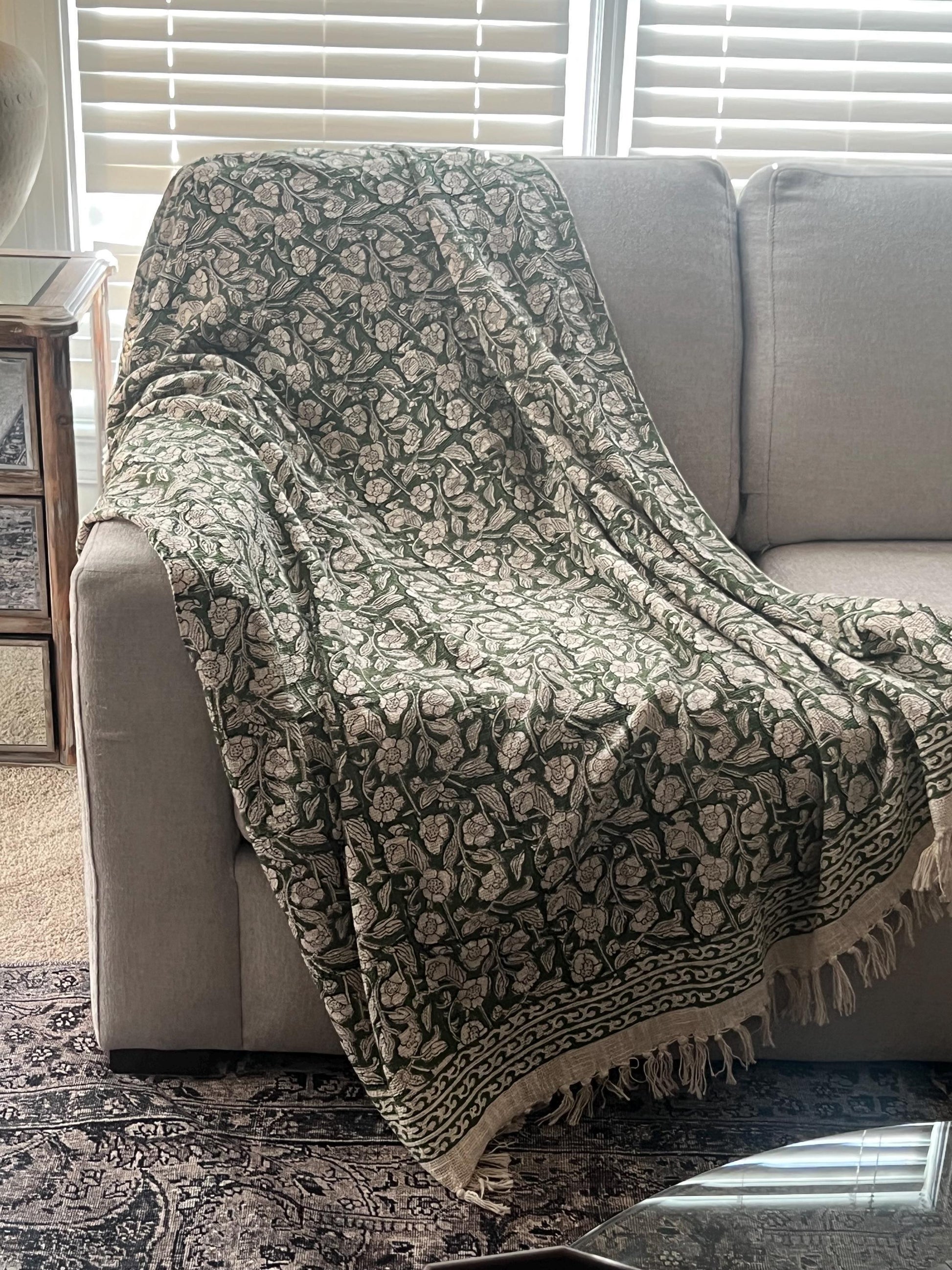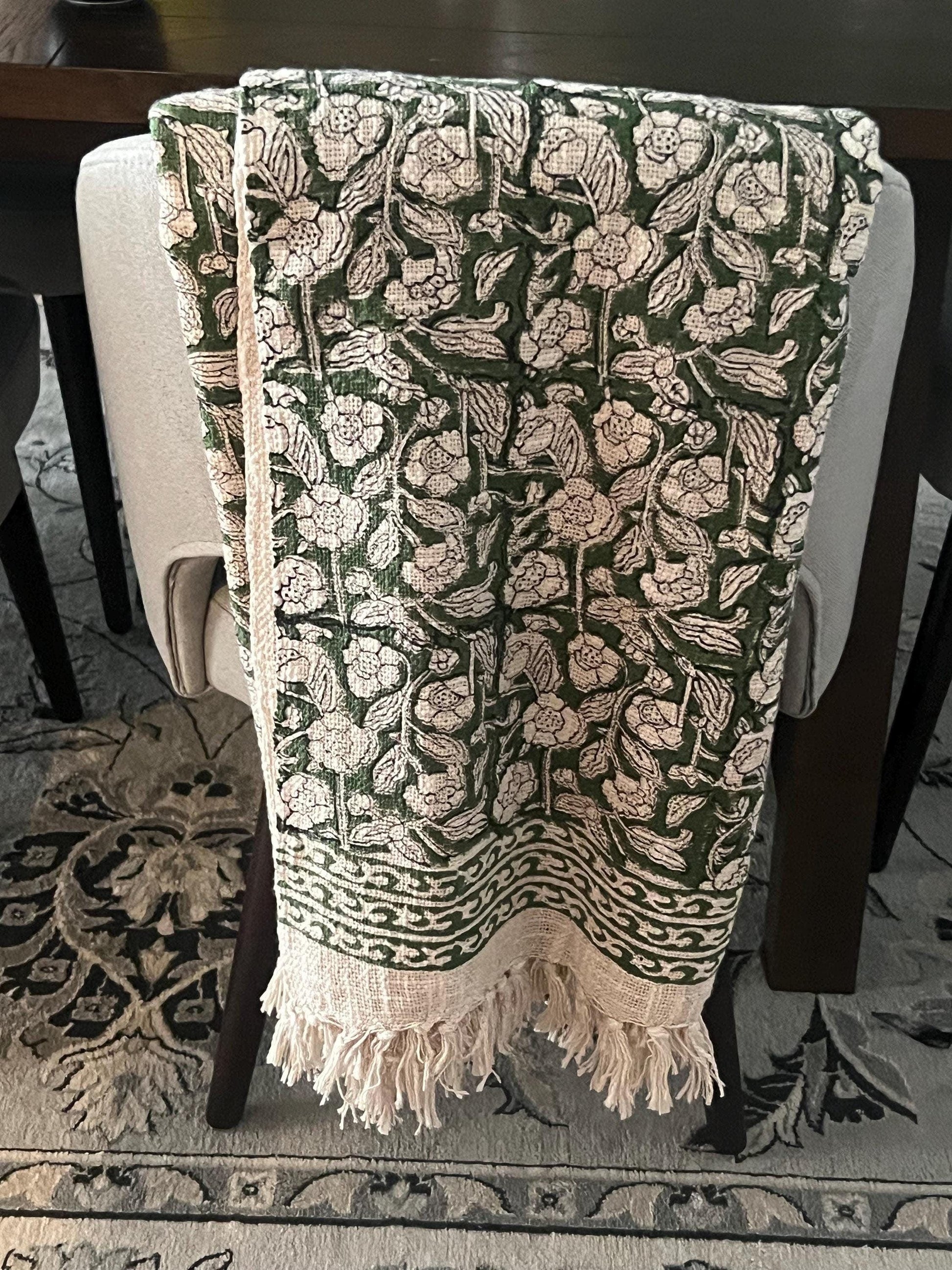 Vintage floral throw blanket pattern that gracefully adorns this beautiful fabric. The intricate hand block print ensures each flower is a testament to artisanal skill, creating a tapestry of nature-inspired artistry. Complemented by charming tassels, these blankets transforms into a visual masterpiece that effortlessly merges modern aesthetics with bohemian flair for farmhouse decor, Home Inspiration