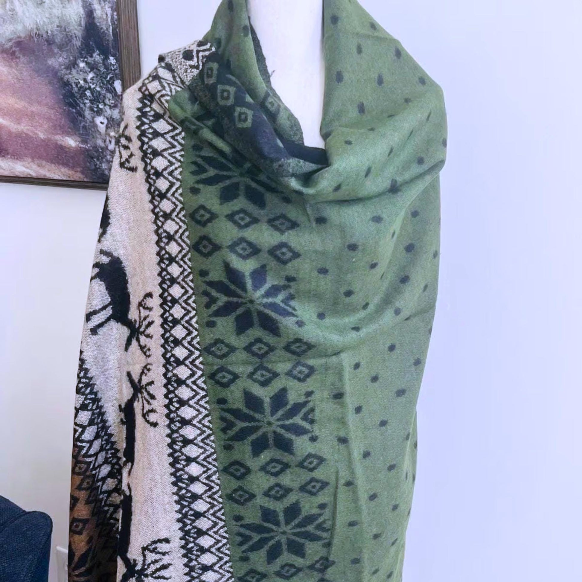 This scarf is sustaibally soruced. Enviorment friendly 80% wool of mountain goat and 20% Cotton. The green chritmas scarf is extra long and cozy. the sracf can be worn both side, one side is Black combo and other side is red combo.