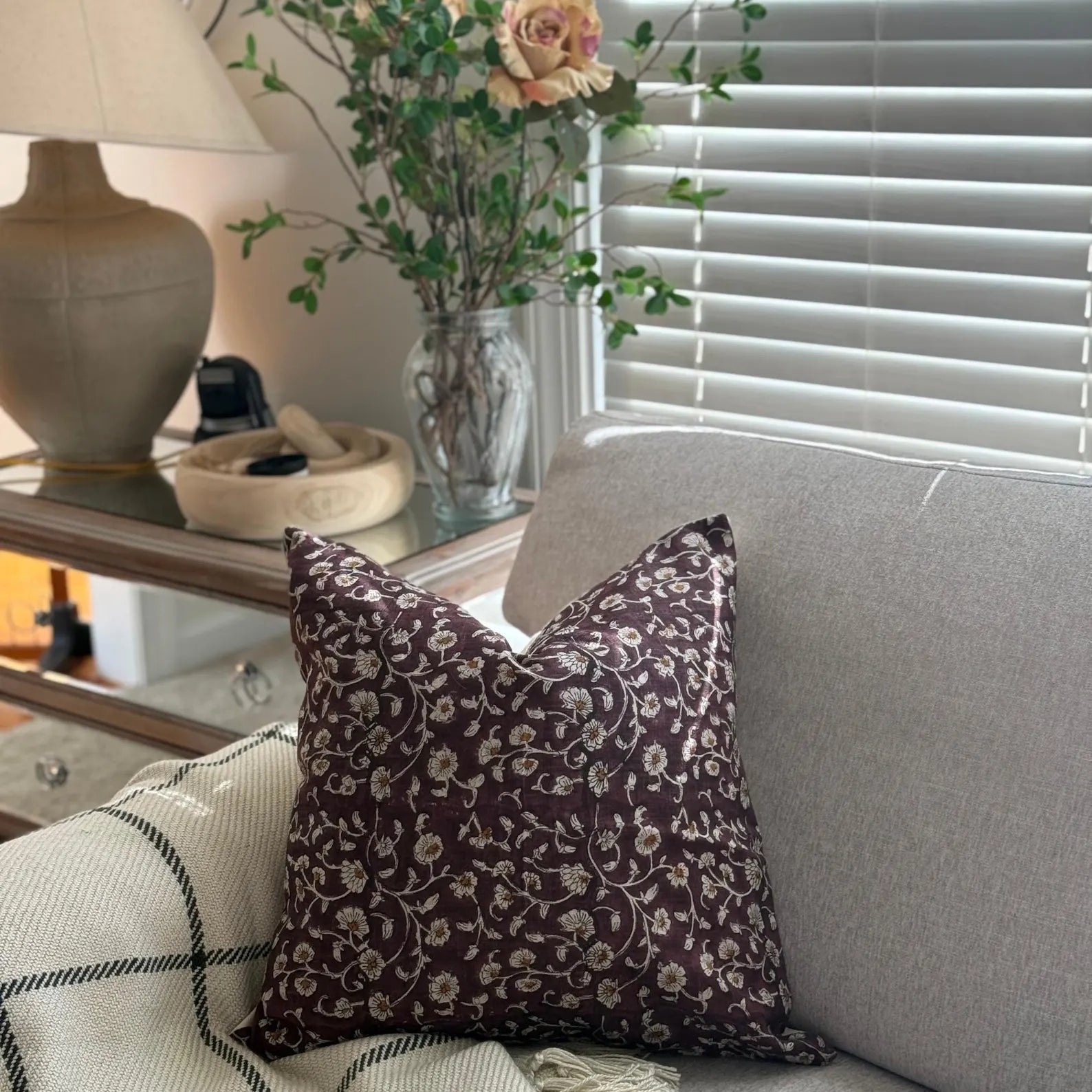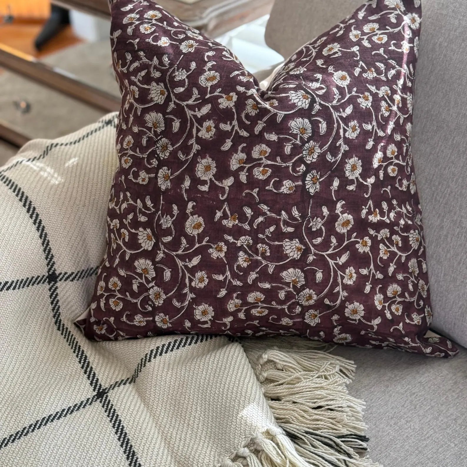 Linen Floral Block Print Cotton Pillow Cover, Farmhouse Decor