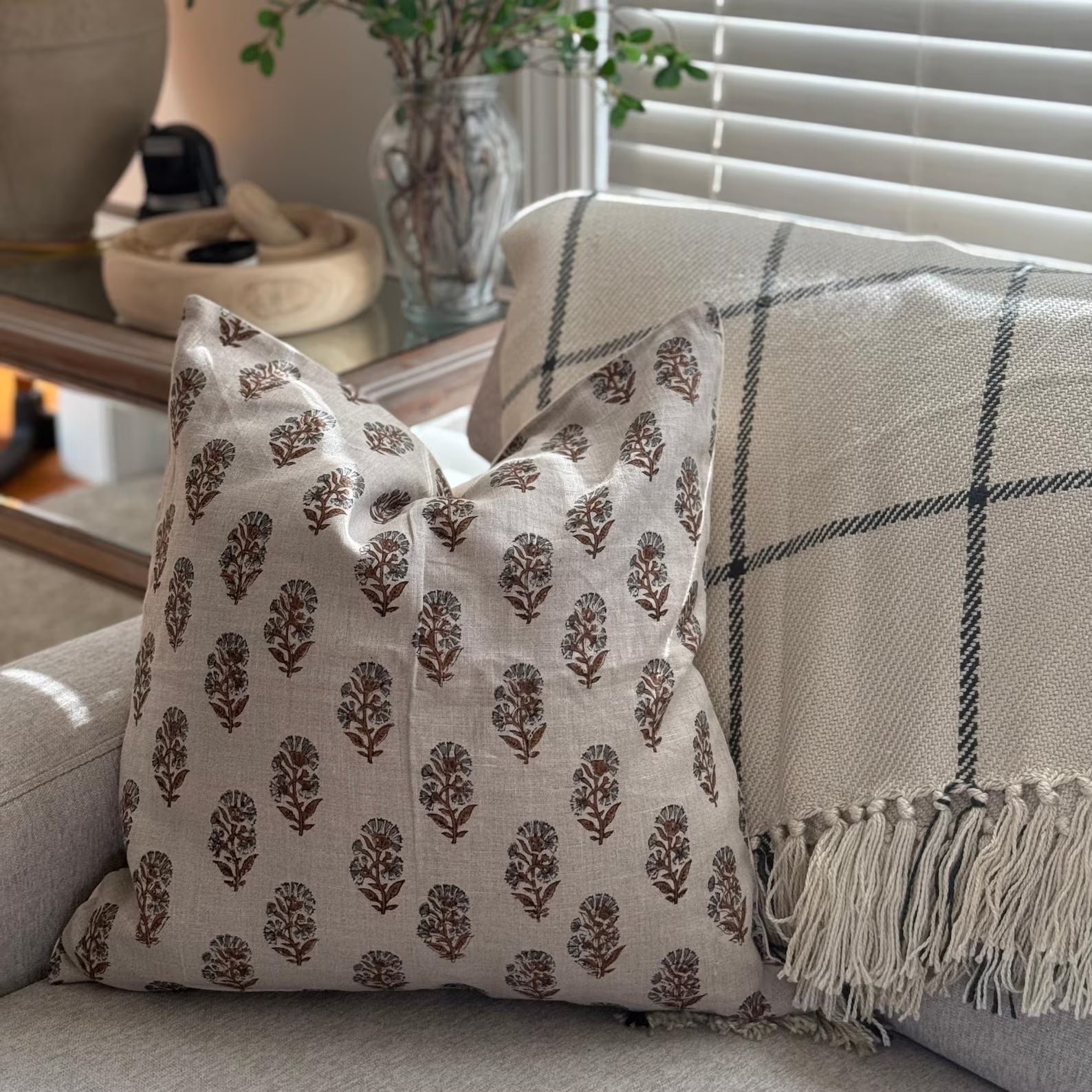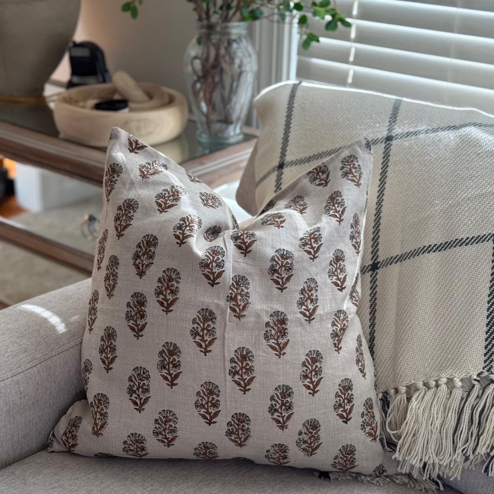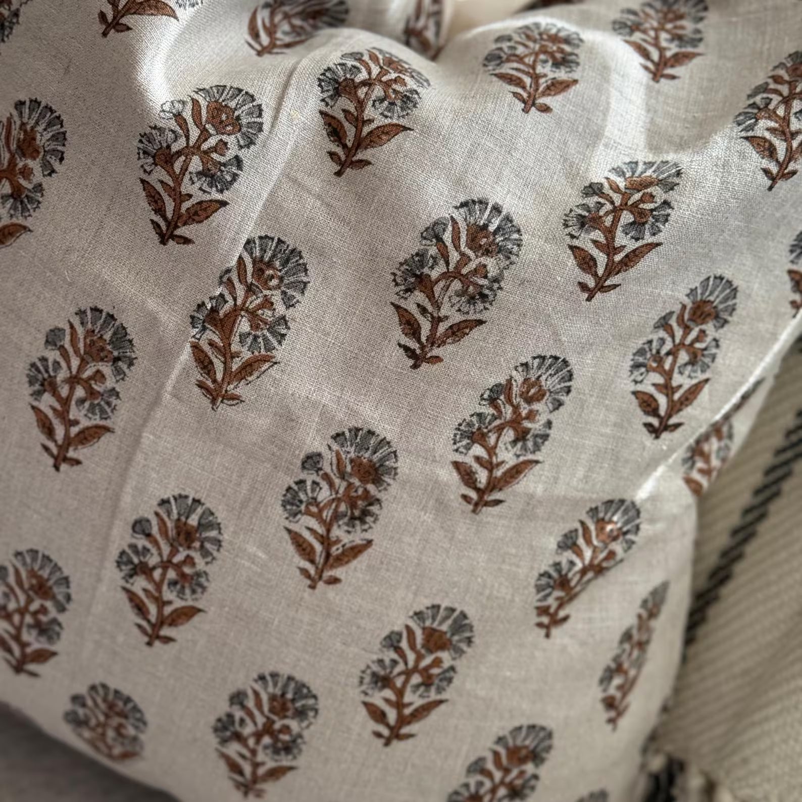 Linen Floral Block Print Pillow Cover, Farmhouse Decor