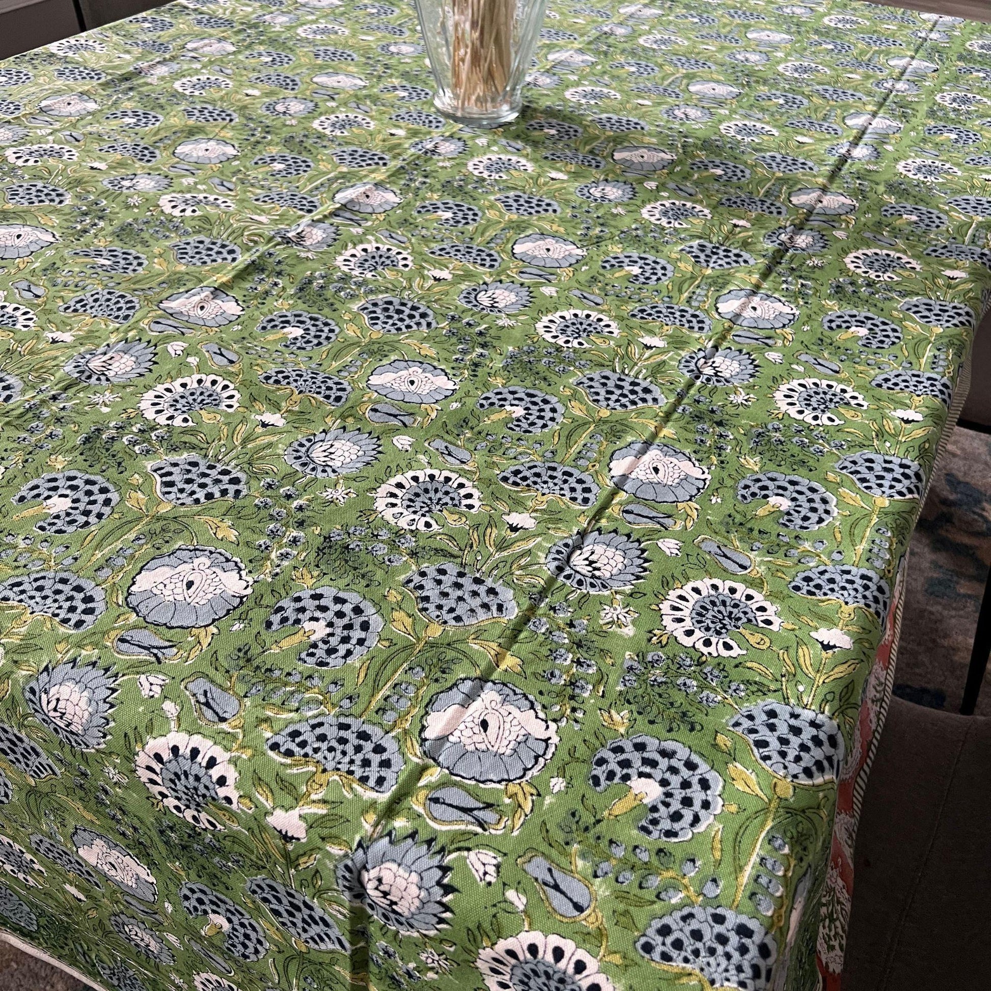 Sage Green Floral Tablecloth: Hand Block Printed Cotton, 60x90