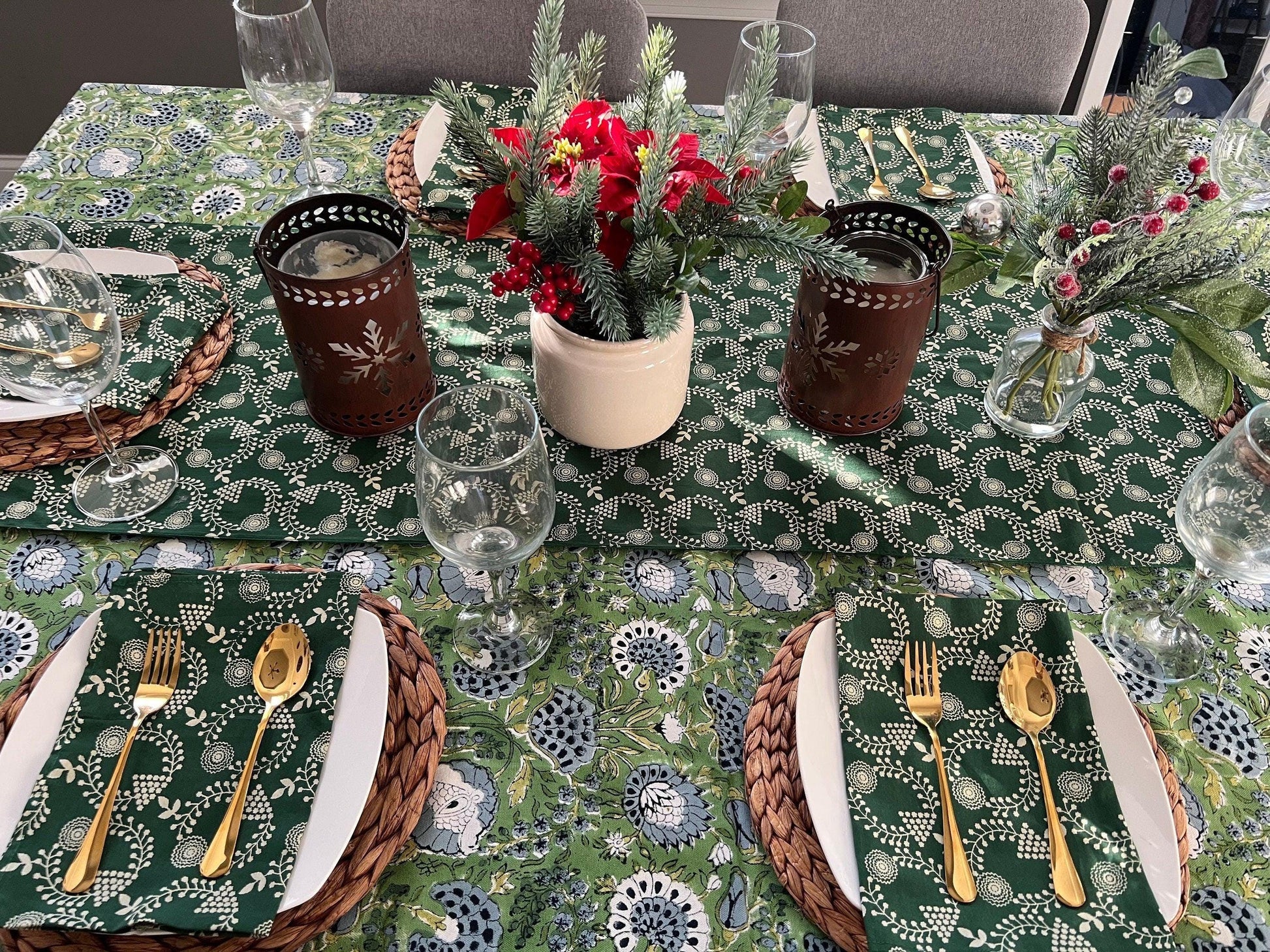 Green Indian block print tablecloth will fill in your table space, The earthy green and white color tablecloth has been handcrafted for durability.