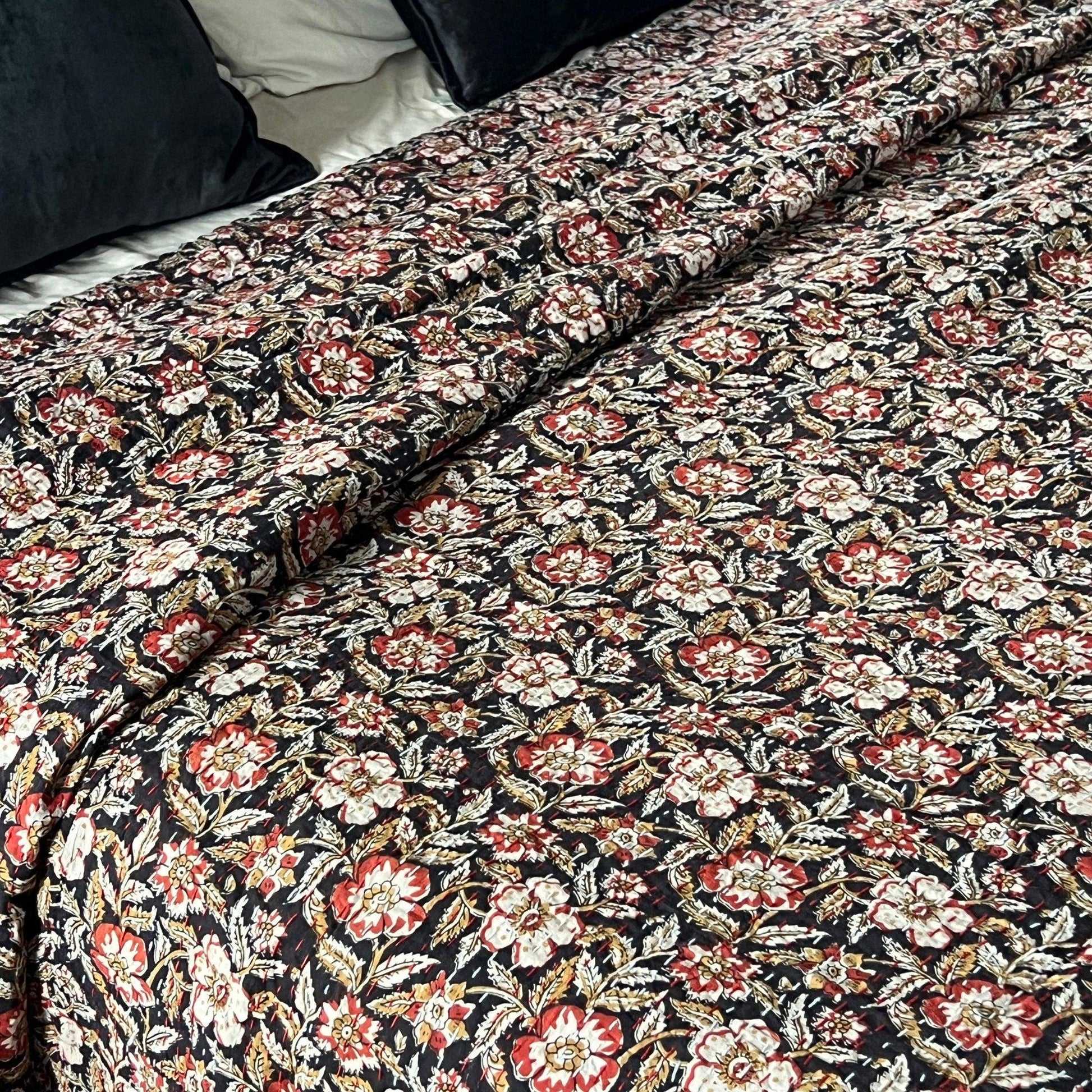 Vintage Floral Kantha Bedspread, Handmade Block Print Cotton Throw
