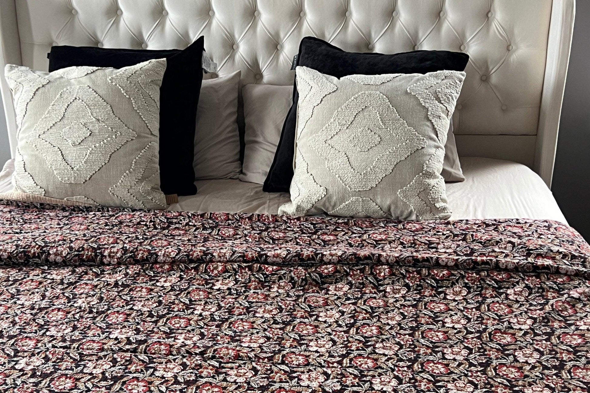 The floral kantha quilt in burgandy is made in 100% cotton fabric with two layers of cotton which has been quilted together with small hand stiched across the fabric, the technique known as kantha, traditional ancient and most loved style in India in quilts,